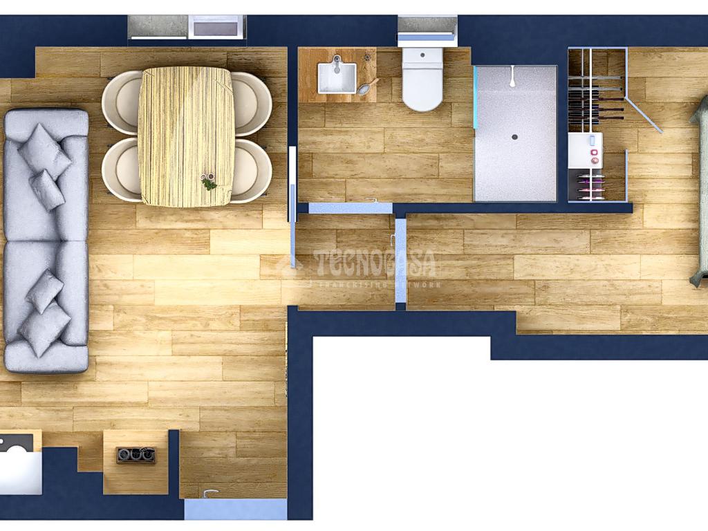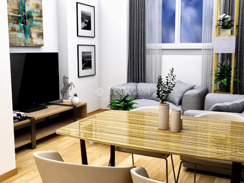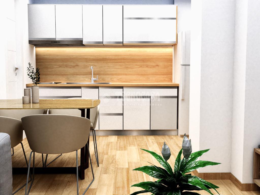 • Salón con cocina americana integrada, configurando un espacio abierto,