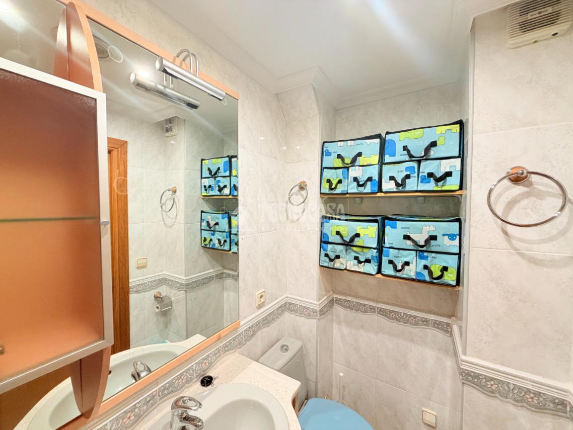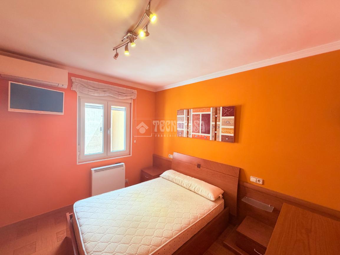 La vivienda cuenta con tres dormitorios. El dormitorio principal destaca por su amplitud y un gran armario empotrado de seis puertas, ofreciendo una excelente capacidad de almacenaje, además de aire acondicionado y televisión. El segundo dormitorio es individual y cumple perfectamente su función, mientras que el tercero aporta versatilidad, siendo ideal como despacho, habitación de invitados o espacio adicional.